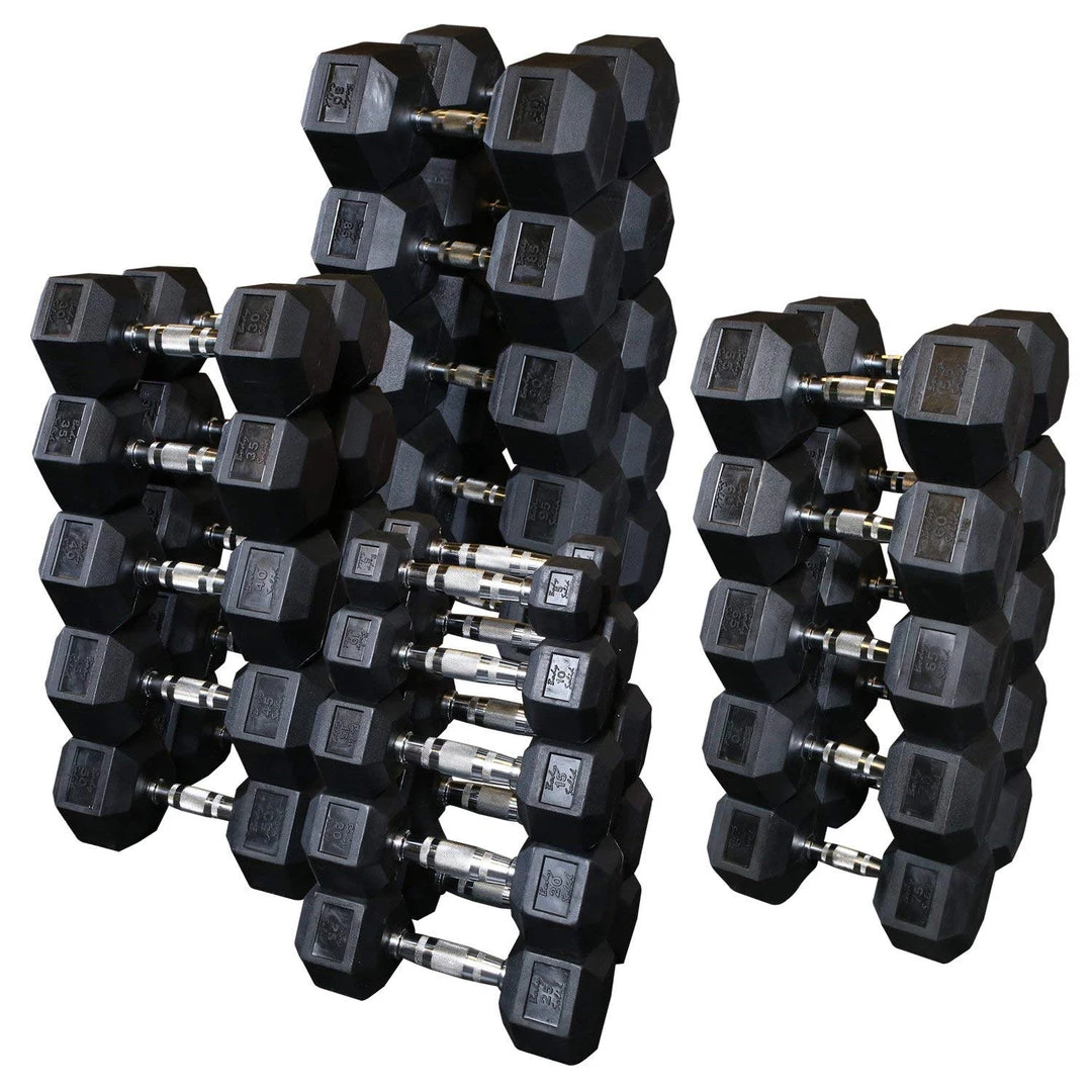- (2 Each) 5-100 lbs. in 5 lb. Increments: 2100lbs. total. Includes 40 Dumbbells. (2 each): 5, 10, 15, 20, 25, 30, 35, 40, 45, 50, 55, 60, 65, 70, 75, 80, 85, 90, 95, 100 lbs.