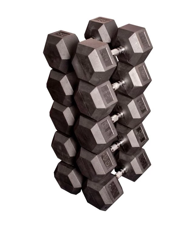 Add more variety to your workout and strength to your body with the Commercial Rubber Hex 80-100 lb Dumbbell Set. Each dumbbell is made of solid cast-iron and features a six-sided anti-roll design. Virgin rubber coating protects your equipment, walls and floors. A pin mechanism inside the dumbbell prevents loosening and spinning. Enjoy the durability, high quality rubber ends and contoured handles of the Commercial Rubber Hex 80-100 lb Dumbbell Set.
