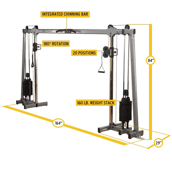 Sturdy and stable, the new design lets you exercise virtually every major muscle group in your body. Interchangeable cable handles provide an unlimited number of possibilities for all experience levels, and the extra wide and tall mainframe provides you with easy access to an endless array of high and low pulley exercises. The Cable Crossover’s unique pull-up station offers multiple grip positions, and dual independent carriages have been ergonomically designed to offer twice as many height adjustments as previous Body-Solid crossover stations.