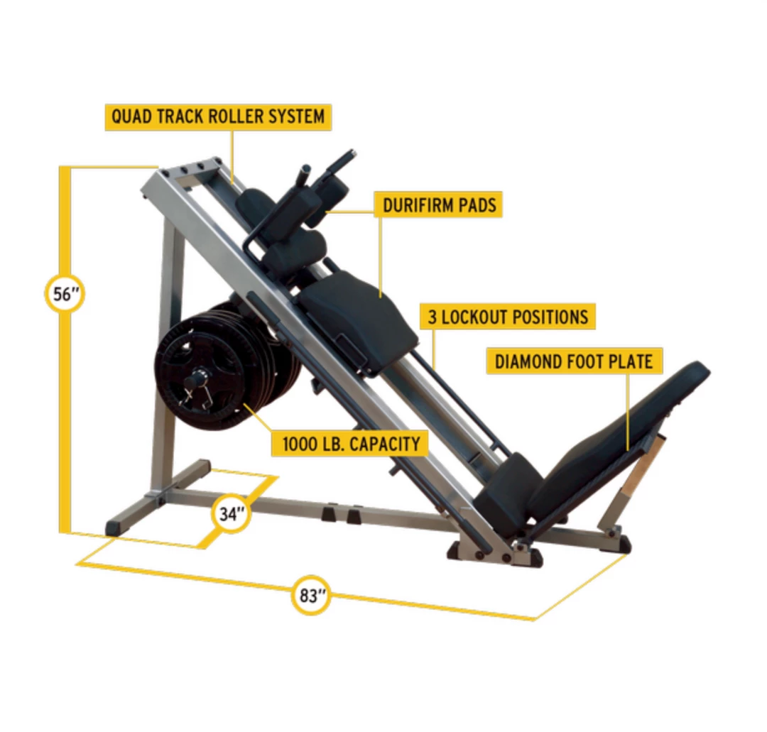 - Extra-heavy gauge Diamond Plate foot platforms for both Leg Press and Hack Squat positions