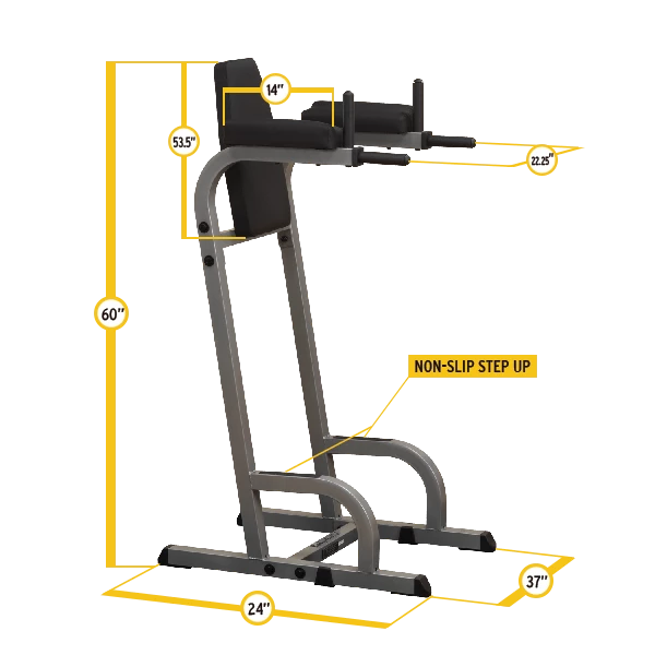 Body-Solid GVKR60 is designed to provide an intense ab workout while eliminating strain on the lower back, the Vertical Knee Raise Machine is hard to beat for vacuuming the waistline. Easy and convenient step entry makes getting started a breeze. Thick, comfortable DuraFirm™ back pads and arm supports reduce fatigue and discomfort allowing you keep working on your abs and obliques. Both machines feature Dip Station handles with oversized handgrips for a killer triceps / deltoid / lower pec workout. Rock solid support and stability is delivered via heavy-gauge steel frames with all-4-side welded construction.