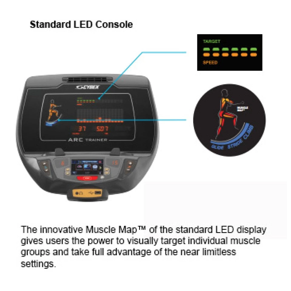 More results in less time. Research shows that the Cybex Arc Trainer burns more calories than any other cross trainer or elliptical cross trainer tested. The science behind the Arc Trainers big calorie burn is the Arc motion. It engages the right muscles quads and glutes that demand lots of energy from the body when they are called upon to work. That means big calorie burn. And because the Arc is demanding of the muscles not the joints, it can be used longer without putting a strain on the knees, hip or back.