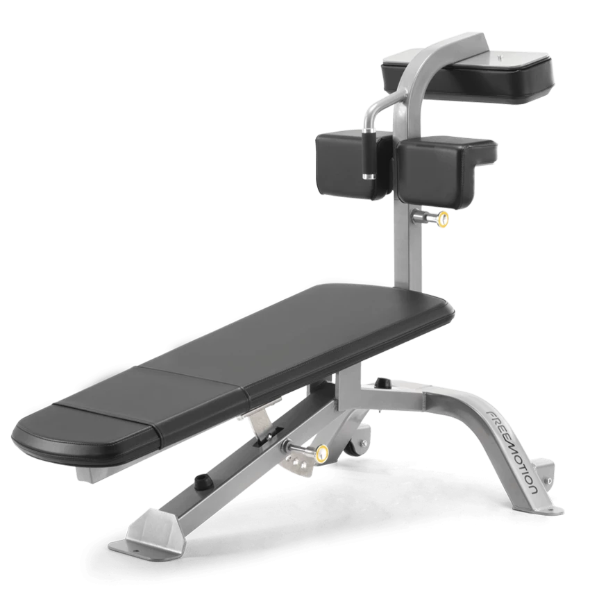 The first things you may notice about the EPIC Abdominal Bench are the wider-than-normal bench pad and how it positions feet up. The flat and decline positions turn up the intensity; add a kettlebell and this strength training workout instantly transforms into an aerobic one. Pads are made with high-quality vinyl and long-lasting 1.5 in (3.8 cm) foam. Bolt-down holes add to the bench’s stability. Made with heavy-duty 11-gauge steel construction, the Freemotion Ab Bench is also electrostatically powder-coated for a professional finish.