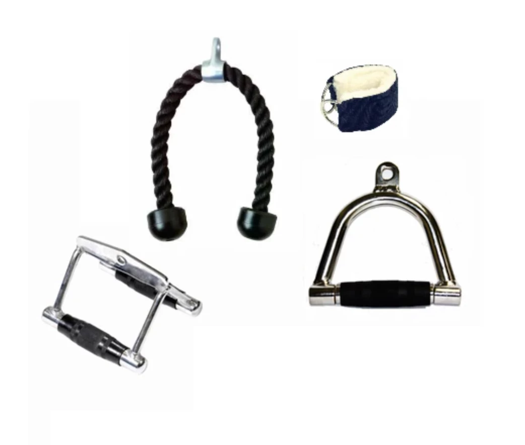 Premium commercial quality cable attachments made in the USA and durable enough to last forever. These high-quality accessories will give you the tools to hit the total body in your next workout. Includes a tricep rope, 2 swiveling chrome dumbbell handles with padded grip, chrome triangle close grip row attachment with padded grip and cushioned ankle strap. This set sold separately retails for $299.