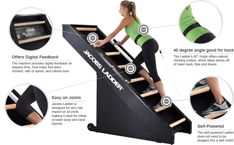 Unlike most cardio machines, this patented treadmill climber utilizes low impact, high range of motion exercise to provide a superior cardio workout to both the upper and lower body. Jacobs Ladder is an innovative cardio machine with ladder-type rungs on a non-motorized continuous treadmill.